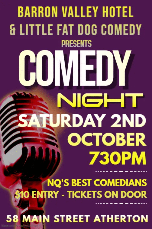 More great news from the north is the return of comedy nights at the Barron Valley Hotel in Atherton. My mate Peter Sheere was one of the first experienced local comics to offer their support and encouragement for what I was doing. I’m forever grateful for that.